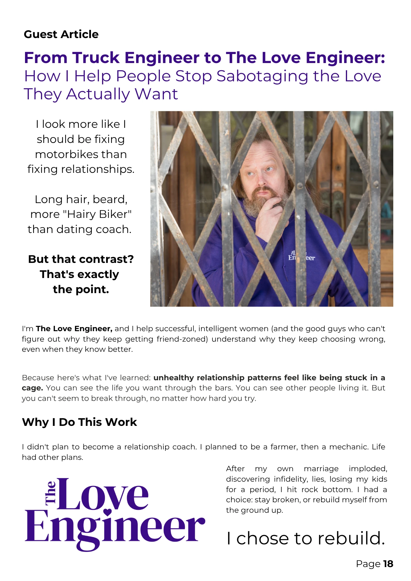 Drawing on an engineering mindset of understanding how systems truly work, The Love Engineer offers a practical and compassionate approach to relationship coaching. The focus is not on quick fixes or dating tactics, but on helping women shift long-held patterns, regulate their nervous system, and step into partnerships where they no longer have to lead alone.